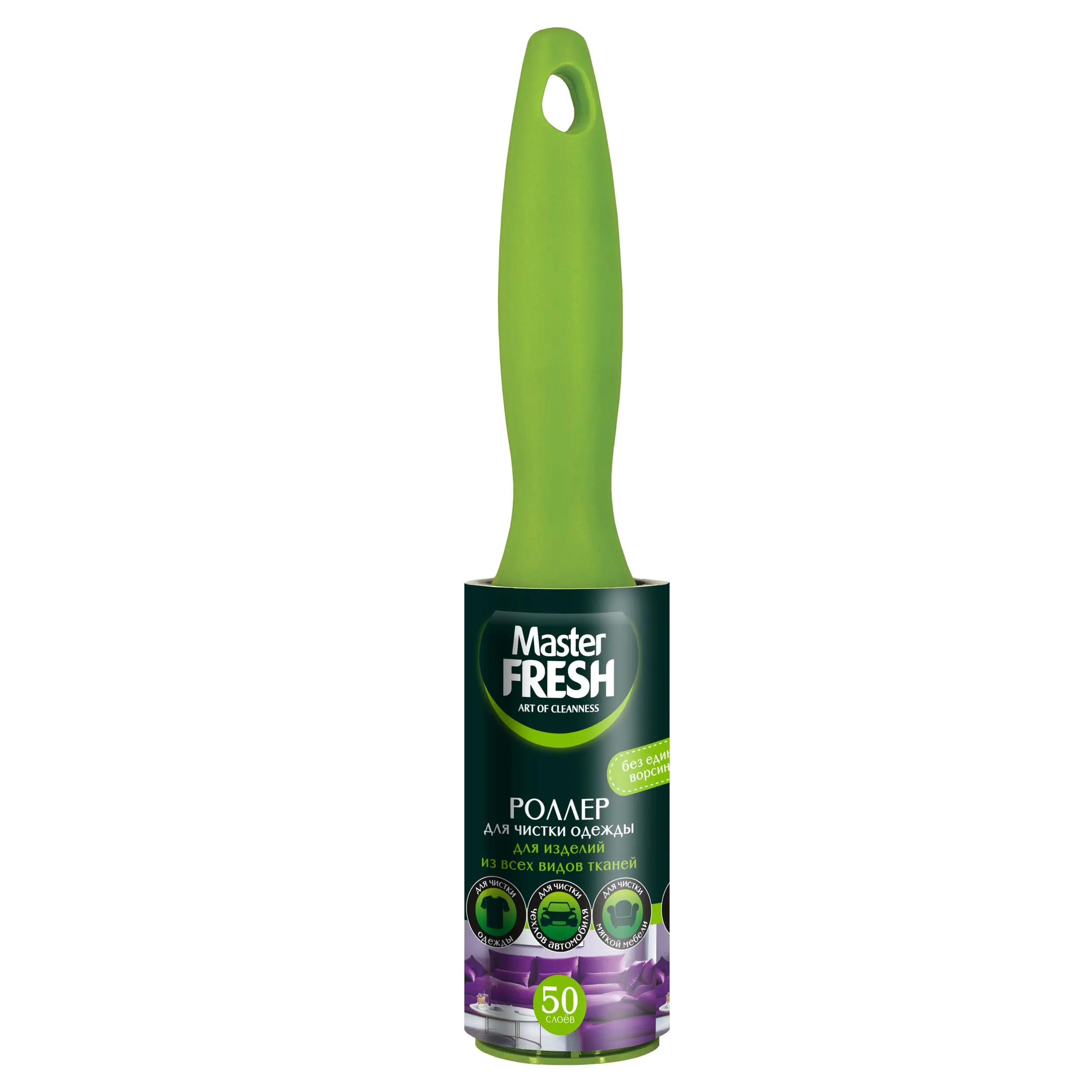Роллер для чистки одежды Master Fresh убирает ворсинки, нитки, пух, шерсть животных, мелкие крошки и обрывки бумаги. Рекомендуется использовать при очищении одежды, мебели, салонов автомобилей и других изделий из любых видов ткани. Эргономичная ручка из качественного пластика удобна в использовании: не выскальзывает из руки, не разбалтывается. Липкий слой убирает загрязнения, при этом не оставляя следов на поверхности материала. Диагональная намотка позволяет одним движением удалять использованный слой. В роллере Master Fresh 50 листов. Так же вместе с роллером можно приобрести запасные блоки к роллеру Master Fresh. Они легко заменяются. Сменные блоки идут по 2 штуки в упаковке.