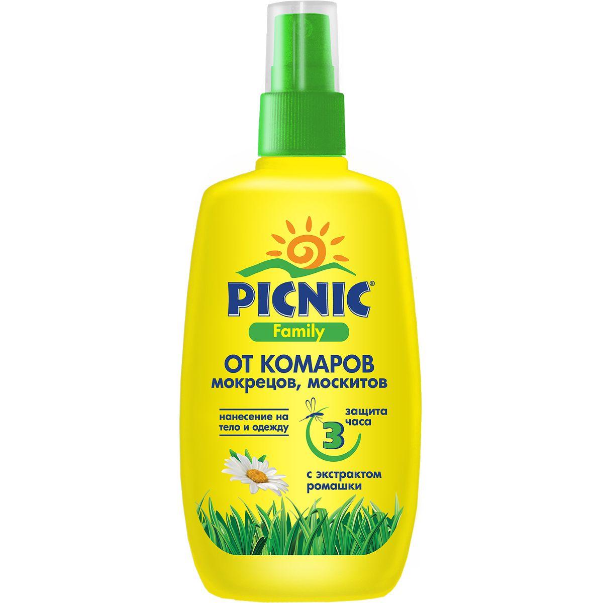 й с экстрактом ромашки «Picnic Family» гарантированно защитит вас и ваших родных от комаров, мокрецов и москитов. Средство не содержит спирта.