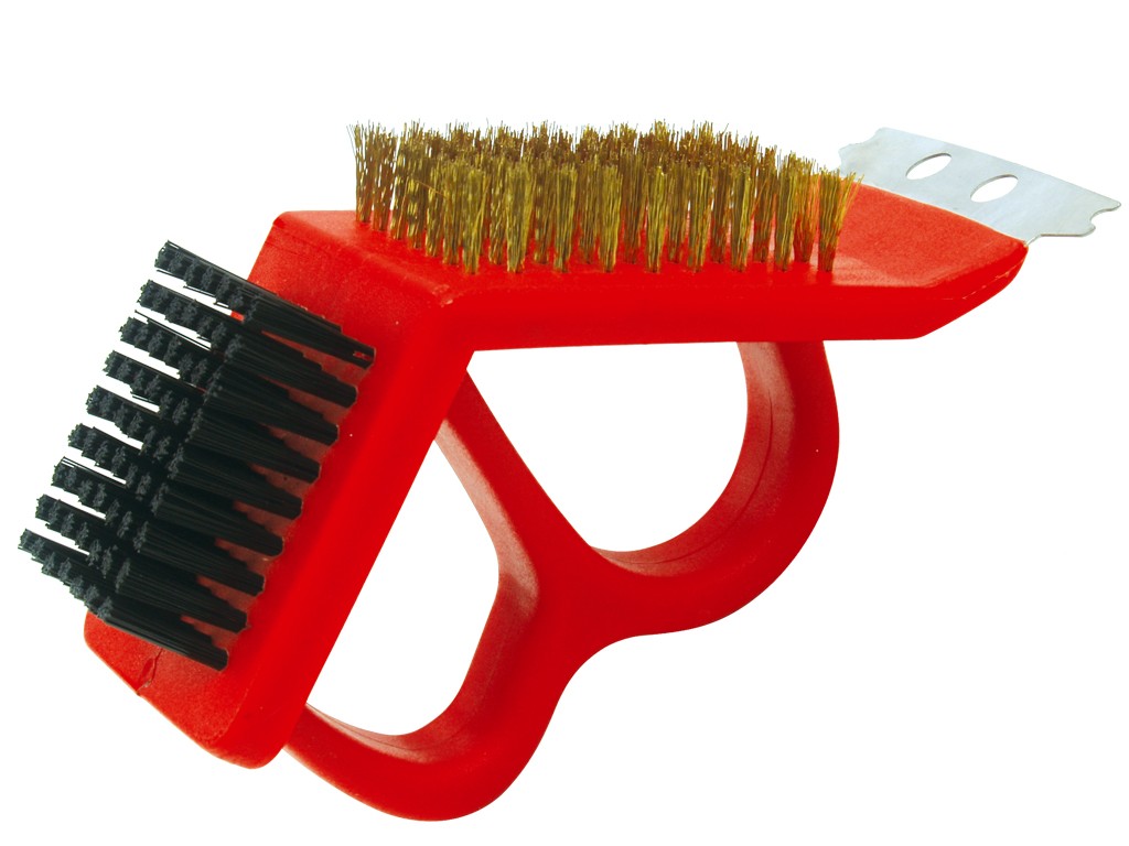 • пластиковый ворс удаляет жир с деликатных покрытий, • стальной скребок и медная щетка удаляют пригоревшую пищу и трудно устранимые загрязнения, • специальные пазы предназначены для чистки прутьев решеток-грильЩетка для чистки гриля на длинной ручке FORESTER