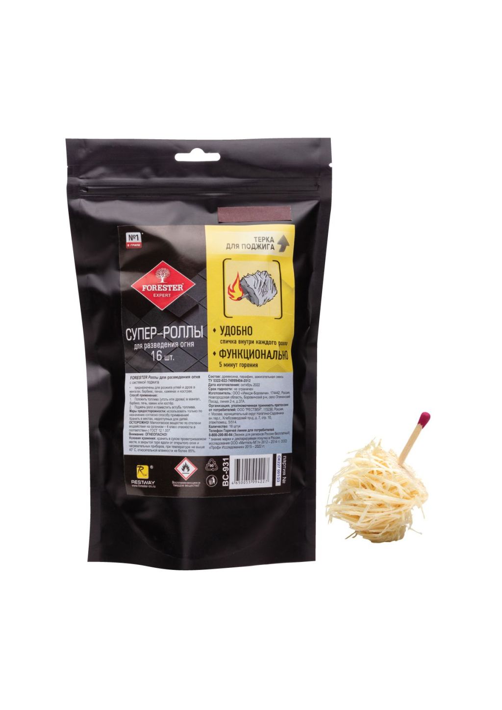 FORESTER Супер-роллы, набор для разведения огня, 16 шт предназначены для розжига углей и дров в мангалах, барбекю, печах, каминах и кострах. 5 минут горения. Спичка внутри каждого ролла. 16 роллов в упаковке.