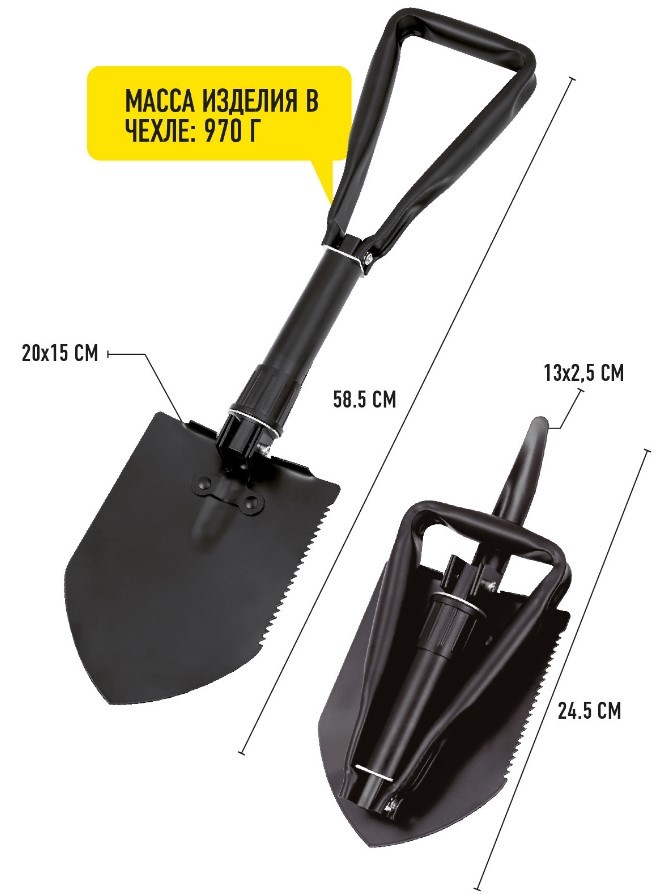 лопата предназначена для обустройства стоянки, активного отдыха и путешествий, в том числе автомобильных;лопата складывается в три сложения;инструмент можно использовать как лопату, кирку и как мотыгу;изготовлена из углеродистой стали, покрыта коррозионностойкой краской;для переноски и хранения изделие укомплектовано чехлом.Многофункциональная складная лопата незаменима для автовладельцев, туристов, дачников и любителей активного отдыха на природе. Рабочая часть изготовлена из высококачественной закаленной углеродистой стали с антикоррозионным покрытием. Эргономичная рукоятка обеспечивает плотный захват и удобство выполнения широкого спектра работ. Функциональный чехол из прочной ткани позволит хранить лопату в любом удобном месте, без опаски повредить или испачкать поверхность.
