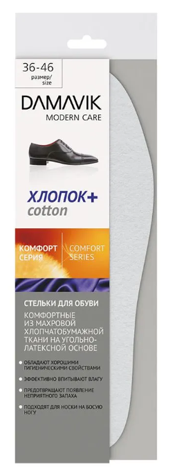 Стельки для обуви «DAMAVIK» из махровой хлопчатобумажной ткани на угольно-латексной основе обладают гигиеническими свойствами. Активированный уголь, входящий в состав нижнего слоя, эффективно впитывает влагу и предохраняет от появления неприятного запаха.