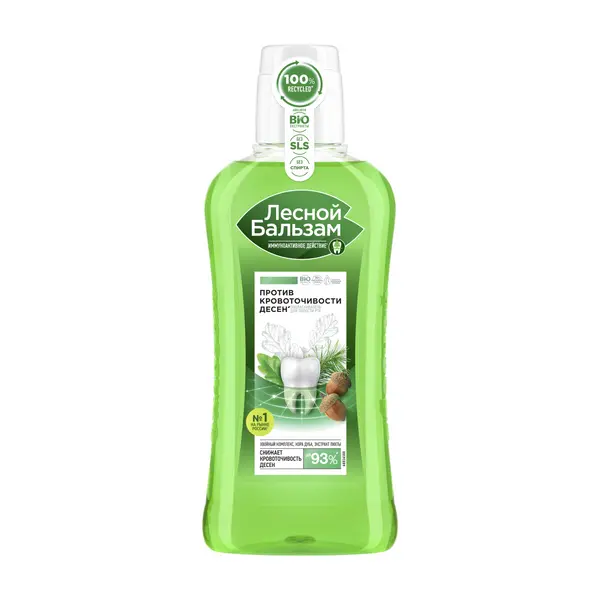 Профилактический ополаскиватель для полости рта Лесной бальзам c иммуноактивным действием помогает решить проблему кровоточивости десен и в 2 раза усиливает местный иммунитет полости рта, снижая риск развития проблем с деснами*. Клинически-доказанный эффект: • С первого применения улучшает состояние десен* • До 94% снижает кровоточивость десен при регулярном использовании** • В 5 раз снижает скорость образования налета на зубах, уменьшая бактериальную нагрузку на мягкие ткани полости рта** • не нарушает баланс микрофлоры полости рта Особенности состава: Формула ополаскивателя для полости рта при кровоточивости десен на 95% состоит из компонентов натурального происхождения, имеет насыщенный вкус хвойных масел в сочетании с мятной свежестью. Содержит хвойных комплекс (на основе экстрактов пихты, живицы, можжевельника) с отваром 5 целебных трав, экстрактом коры дуба и соком алоэ. Такой сбалансированный состав способствует укреплению кровеносных сосудов десен, улучшает кровообращение и питание мягких тканей полости рта, препятствует повторному возникновению кровоточивости при чистке зубов.