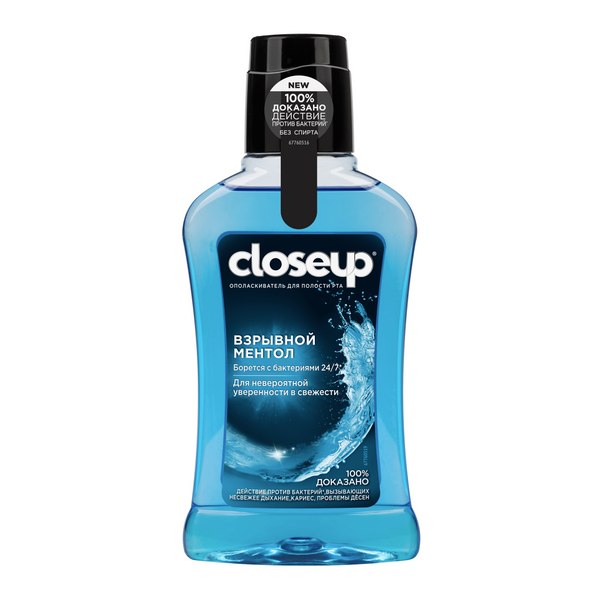 Давай проверим, сможешь ли ты шагнуть навстречу своим желаниям? Осмелишься ли приблизиться к своей цели? Ополаскиватель для полости рта CloseUp Взрывной ментол не сделает за тебя всей работы, но зарядит уверенностью и придаст сил. Ополаскиватель CloseUp легко справится с бактериями*, вызывающими неприятный запах изо рта, а также кариес и проблемы дёсен. Он позаботится о поддержании здоровья полости рта и о твоём свежем дыхании, пока ты занимаешься чем-то действительно важным! CloseUp Взрывной ментол – это защита от бактерий в режиме 24/7*! Используй его ежедневно после приема пищи, а также до и после чистки зубов (не реже двух раз в день), чтобы эффективно очистить даже межзубные промежутки. Твой стоматолог оценит твои усилия! Ополаскиватель не содержит спирт, не сушит полость рта. А свежий вкус ментола заряжает энергией и настраивает на нужный лад. Твой ежедневный уход за полостью рта ещё никогда не был таким бодрящим! Ответственное отношение к окружающей среде – ещё один приоритет компании Unilever. Поэтому стильные голубые флаконы ополаскивателей для полости рта CloseUp Взрывной ментол изготовлены из 100% переработанного пластика.