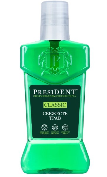 Ополаскиватель PRESIDENT Classic свежесть трав прекрасно освежает полость рта, укрепляет эмаль и служит дополнительной профилактикой кариеса. в состав продукта входят активные компоненты: 1) Фтор - укрепляет эмаль. 2) Ксилитол- подавляет рост бактерий. 3)Ромашка и шалфей - уменьшают воспаление. Без SLS. Ополаскиватель обладает деликатным антибактериальным действием, придает длительную свежесть дыханию. Является эффективным дополнением к зубной пасте PresiDENT Classic для полноценной гигиены полости рта. При разбавлении 1:5 может быть использован как жидкость для ирригатора. Проникает в самые труднодоступные участки. Не содержит спирт.