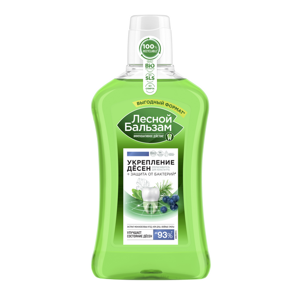 Ополаскиватель для полости рта Лесной бальзам для укрепления десен с экстрактом можжевеловых ягод и корой дуба, в составе которого 98% ингредиентов натурального происхождения, обладает иммуноактивным действием1, защищает от бактерий и заботится о здоровье десен. Ополаскиватель для полости для укрепления десен борется с первопричиной развития серьезных проблем полости рта – зубным налетом, который вызывает кариес и изменение цвета зубов, приводит к образованию зубного камня и кровоточивости десен. Формула ополаскивателя усилена хвойными смолами и экстрактами можжевеловых ягод и коры дубы, не содержит парабенов, SLS и спирта и рекомендован стоматологами для ежедневного использования: • Хвойные смолы оказывают на десны противовоспалительный эффект; • Экстракт коры дуба снимает воспаление и улучшает состояние полости рта; • Экстракт можжевеловых ягод обладает антибактериальными свойствами. Как возникают проблемы с деснами? Некачественное очищение зубов приводит к скоплению бактериального налета, который трансформируется в зубной камень и постепенно начинает травмировать десну и вызывать кровоточивость. Предотвратить образование зубного камня, укрепить десны и уменьшить их кровоточивость поможет серия Лесной бальзам.