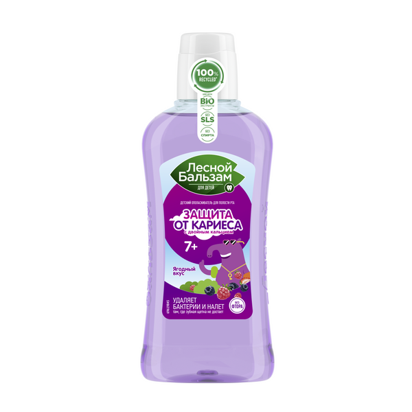 Для усиленной защиты от кариеса после каждой чистки зубов приучите ребенка использовать детский ополаскиватель Лесной бальзам с 7 лет. Он проникает в труднодоступные для щетки места, улучшает качество чистки и защищает от кариеса. Формула ополаскивателя содержит 98% компонентов натурального происхождения, усилена двойным кальцием, обладает приятным ягодным вкусом, не содержит SLS и спирта. Рекомендована стоматологами для детей от 7 лет для ежедневного использования: • двойной кальций укрепляет эмаль зубов; • натуральный антибактериальный комплекс из коры магнолии защищает от образования налета и развития кариеса; • сок алоэ поддерживает здоровье десен; • не содержит фтор. Использование ополаскивателя Лесной бальзам после каждой чистки зубов поможет значимо улучшить домашнюю гигиену полости рта, а именно: • лучше очищать зубы от налета и качественно прочищать межзубные промежутки; • защищать от образования налета и развития кариеса; • заботиться об укреплении десен и зубов.