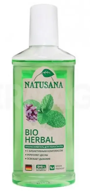 NATUSANA (Натусана) BIO HERBAL ополаскиватель для полости рта благодаря натуральному биокомплексу эфирных масел и экстрактов трав способствует здоровью десен и обеспечивает чистоту полости рта, особенно в недоступных для зубной щетки местах.