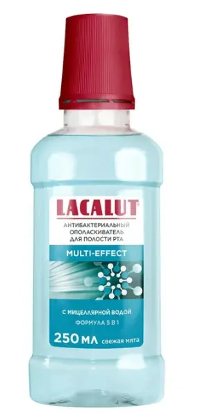 Антибактериальный ополаскиватель для полости рта Lacalut multi-effect снижает образование зубного налета и дополнительно очищает поверхность эмали благодаря мицеллам.