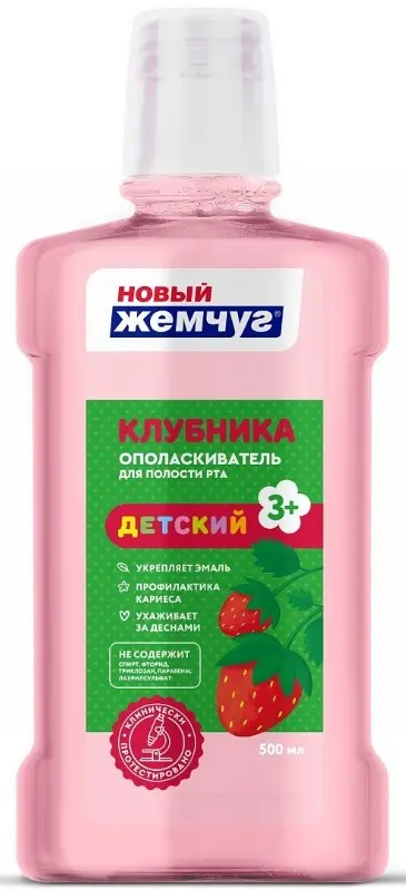 Предназначен для дополнительного ухода за деснами, молочными и коренными зубами детей 3-12 лет. Входящие в состав компоненты осуществляют комплексный уход за полостью рта даже в тех случаях, когда использование зубной пасты невозможно. Ополаскиватель осуществляет профилактику кариеса и укрепляет эмаль. Специальная формула ополаскивателя разработана с учетом особенностей детских зубов. Является эффективным дополнением к детским зубным пастам «Новый Жемчуг». Сочный сладкий вкус клубники приучает детей к соблюдению гигиенических правил. Подходит при ношении брекетов и использовании ирригатора.