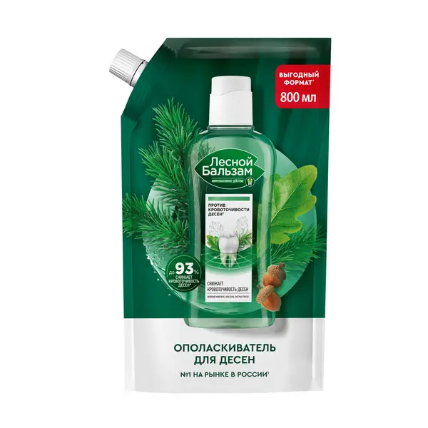 Для ежедневного ухода за полостью рта попробуй профилактический Лесной бальзам c иммуноактивным действием* в выгодном° формате дойпак. Ополаскиватель эффективно борется с кровоточивостью десен; поддерживает естественную микрофлору полости рта*; снижает риск развития проблем с деснами. Формула ополаскивателя включает в себя CPC technology и экстракты трав, не содержит спирта и рекомендована стоматологами для ежедневного использования: • Отвар трав поддерживает естественную микрофлору полости рта*; • Высокоэффективный поливитаминный хвойный комплекс оказывает выраженное противовоспалительное действие на ткани пародонта; • Живица оказывает антиоксидантный и тонизирующий эффект на десны. Клинически доказанный эффект**: • С первого применения улучшает состояние десен. • До 93% снижает кровоточивость десен при регулярном использовании. • В 5 раз снижает скорость образования налета на зубах, уменьшая бактериальную нагрузку на мягкие ткани полости рта. • Не нарушает баланс микрофлоры полости рта*. Формула ополаскивателя Лесной бальзам с экстрактами коры дуба и пихты на 97% состоит из компонентов натурального происхождения и имеет насыщенный хвойный вкус. Содержит хвойный комплекс (на основе экстрактов пихты и ели), отвар 5 целебных трав, экстракт коры дуба и сок алоэ.