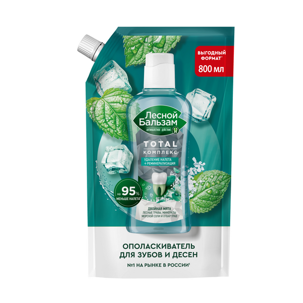 Для ежедневной эффективной защиты полости рта попробуй ополаскиватель Лесной бальзам TOTAL Комплекс с морской солью, маслом мяты и экстрактами лесных трав. Он воздействует на первопричину развития серьезных проблем полости рта: удаляет налет даже в межзубных промежутках; помогает предотвратить разрушающее действие налета на зубы и десны; восстанавливает эмаль и укрепляет десны. Не является лекарственным средством. Применение не освобождает от посещения стоматолога. TOTAL – ТОТАЛ.