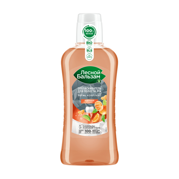 Ополаскиватель для рта Лесной бальзам с мандарином, лаймом и мятой — это эффективное средство для гигиены ротовой полости, позволяющее эмалировать зубы и устраняющее неприятный запах. Ополаскиватель для полости рта борется с бактериями 24 часа в сутки, 7 дней в неделю*. Средство – полоскатель для рта создает приятное ощущение чистоты и свежести. Ополаскиватель для рта содержит обогащенный натуральными ингредиентами состав, куда входят: минералы морская соль, сок лайма, сок мандарина, экстракт мяты, содержание глицерофосфата. Ополаскиватель для полости рта с антибактериальным эффектом обеспечивает защиту от неприятного запаха изо рта, обращая внимание на зубную эмаль. Освежающий ополаскиватель для рта Лесной Бальзам оказывает на 100% доказанное антибактериальное действие*. Лесной Бальзам ополаскиватель 400 мл не имеет в составе спирта и SLS. Ополаскиватель для полости рта поддерживает здоровье ротовой полости за счет замедления роста бактериального налета, освежает дыхание. Жидкость для полоскания рта с добавлением мандарина, лайма и мята – это средство, предпочитаемое стоматологами. Тщательно полоскайте рот в течение 30 секунд, не реже двух раз в день.