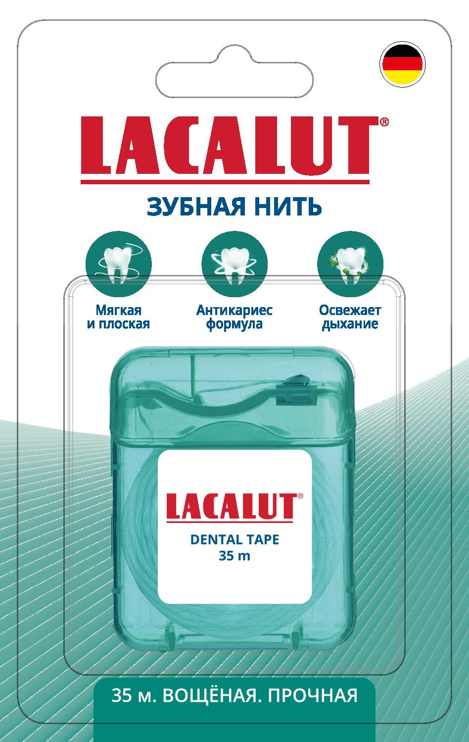 Зубная нить LACALUT® dental tape изготовлена из высокопрочного тефлона. Благодаря плоской форме она легко проникает в самые узкие межзубные промежутки, эффективно очищая их. Нить пропитана фторидом, который защищает зубы от контактного кариеса и снижает образование бактериального налёта. Вощёное волокно зубной нити обеспечивает лёгкое скольжение даже в узких межзубных промежутках, нить не рвется и не расслаивается. Подходит для чувствительных дёсен. Мятный вкус придает ощущение свежести.