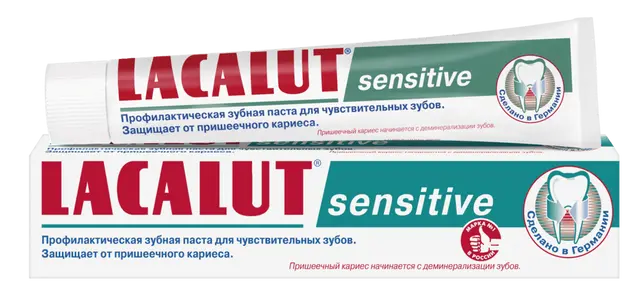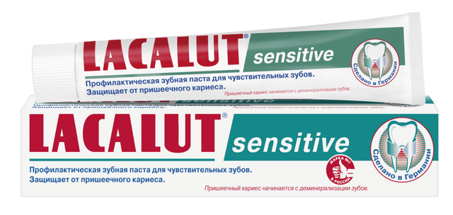 Зубная паста Lacalut sensitive содержит двойную комбинация фторидов, которая позволяет реминерализовать зубную эмаль и снизить ее чувствительность. Антисептик и лактат алюминия в составе пасты снижают воспаление и кровоточивость десен, которые часто сопровождают повышенную чувствительность зубов в области шейки. Растительные компоненты аллантоин и бисаболол усиливают противовоспалительное действие зубной пасты.