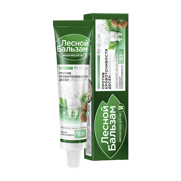 Новая зубная паста Лесной бальзам c иммуноактивным действием помогает решить проблему кровоточивости десен и в 2 раза улучшает работу собственного иммунитета полости рта, снижая риск развития проблем с деснами*. Клинически-доказанный эффект: - С первого применения улучшает состояние десен* - До 94% снижает кровоточивость десен при регулярном использовании** - В 5 раз снижает скорость образования налета на зубах, уменьшая бактериальную нагрузку на мягкие ткани полости рта** Особенности состава: Насыщенный хвойный вкус. Содержит хвойных комплекс (на основе экстрактов пихты, живицы, можжевельника) с отваром 5 целебных трав и экстрактом коры дуба. Богатый натуральный состав способствует укреплению кровеносных сосудов десен, улучшает кровообращение и питание в мягких тканях полости рта, препятствует повторному возникновению кровоточивости при чистке зубов. Зубная паста изготовлена на отваре 5 трав (ромашка, тысячелистник, крапива, зверобой, чистотел). Отвар трав используется взамен обычной воды и получается в результате низкотемпературной экстракции (35%), что позволяет достичь максимально полного переноса ценных веществ из растений в отвар. Зубная паста бережно очищает эмаль за счет природного абразива - диоксида кремния (Silica).
