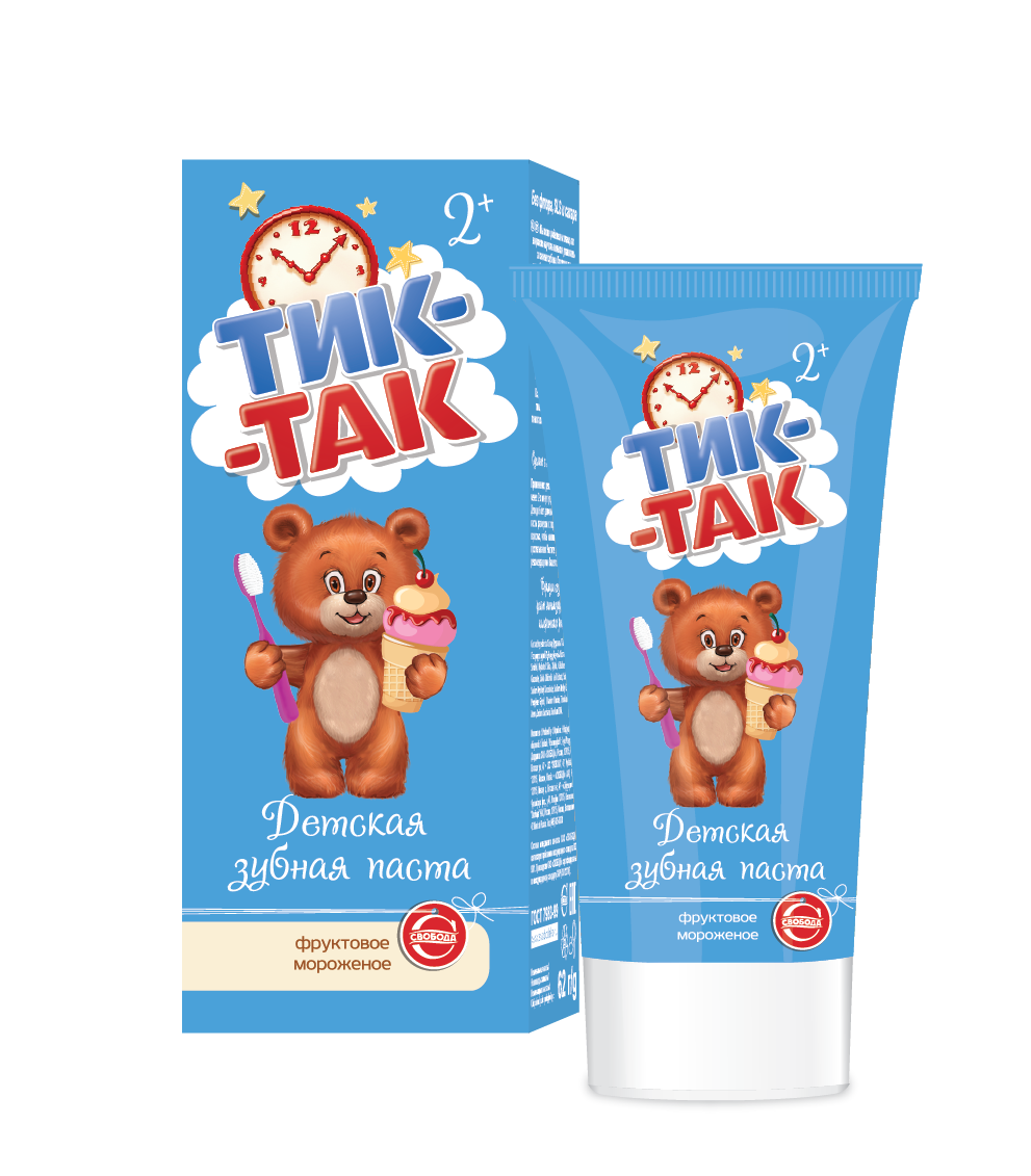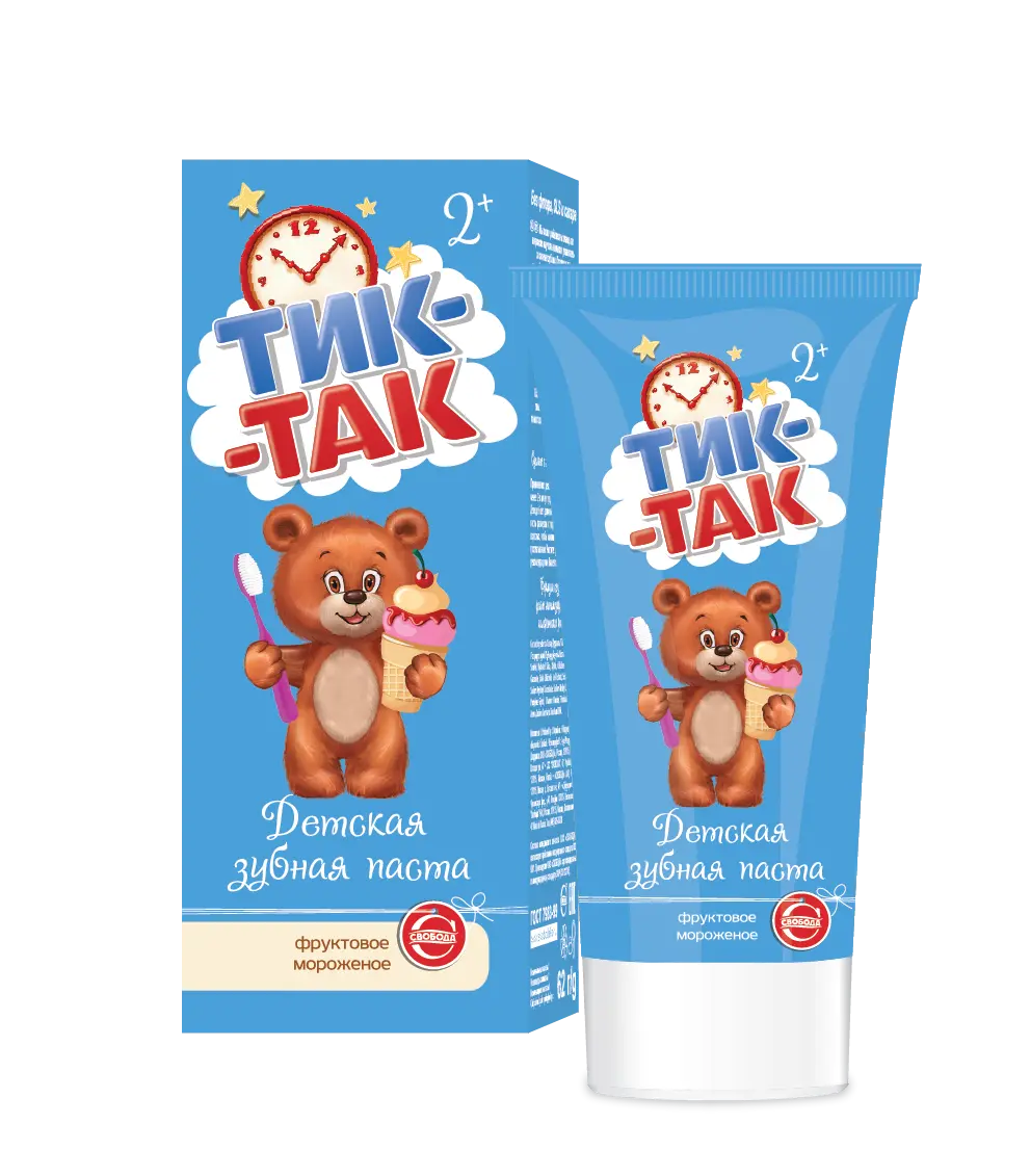 Особая мягкая очищающая система зубной пасты Тик-Так фруктовое мороженое позволяет бережно ухаживать за полостью рта ребёнка, не повреждая структуру эмали молочных и первых постоянных зубов.