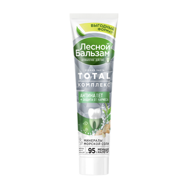 Попробуй новую зубную пасту для комплексной защиты полости рта - Лесной бальзам TOTAL Комплекс с морской солью, экстрактом имбиря и чаем матча, в составе которой 95% ингредиентов натурального происхождения. Формула зубной пасты TOTAL Комплекс обеспечивает усиленное очищение и борется с первопричиной развития серьезных проблем полости рта – зубным налетом! Зубной налет вызывает кариес, влияет на изменение цвета зубов, приводит к образованию зубного камня и кровоточивости десен. Зубная паста Лесной бальзам TOTAL Комплекс содержит на 50% больше очищающих частиц , эффективно удаляет налет даже в межзубных промежутках, защищает от образования зубного камня и проблем с деснами. Клинически доказано: до 95% меньше зубного налета! Формула зубной пасты усилена минеральными компонентами: морская соль защищает от бактерий и помогает предотвратить разрушающее действие налета на эмаль зубов, а кальций способствует ее укреплению. Экстракт имбиря и чай матча способствуют укреплению десен и оказывают тонизирующий эффект. Бережное очищение эмали происходит за счет абразива природного происхождения – диоксида кремния (Silica), который имеет округлую форму частиц и не царапает эмаль в процессе чистки, при этом позволяя добиться качественного удаления налета по всей поверхности зубов. Зубная паста не содержит парабенов и химических отбеливателей, рекомендована стоматологами для ежедневной защиты зубов и десен.