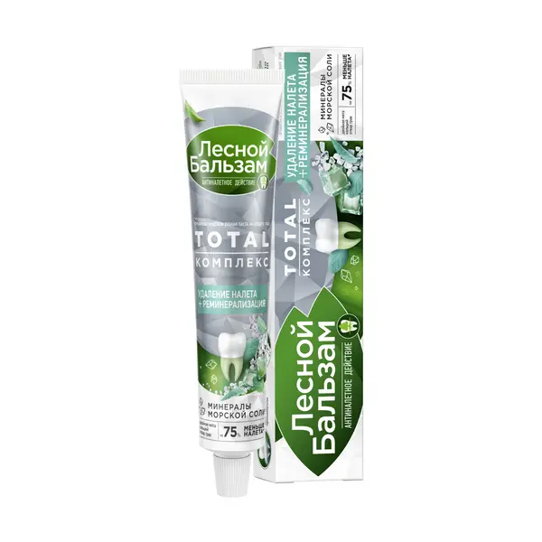 Попробуй новую зубную пасту Лесной бальзам TOTAL Комплекс с морской солью, маслом мяты, отваром трав и кальцием. Формула зубной пасты на 95% состоит из ингредиентов натурального происхождения, интенсивно очищает зубы от налета, защищает от зубного камня и укрепляет эмаль, обеспечивая комплексную защиту всей полости рта.Формула зубной пасты TOTAL Комплекс обеспечивает усиленное очищение1 и борется с первопричиной развития серьезных проблем полости рта – зубным налетом! Зубной налет вызывает кариес, влияет на изменение цвета зубов, приводит к образованию зубного камня и кровоточивости десен. Зубная паста Лесной бальзам TOTAL Комплекс содержит на 50% больше очищающих частиц1, эффективно удаляет налет даже в межзубных промежутках, защищает от образования зубного камня и проблем с деснами.Клинически доказано: до 95% меньше налета!2Формула зубной пасты усилена минеральными компонентами: морская соль защищает от бактерий и помогает предотвратить разрушающее действие налета на эмаль зубов, а кальций восстанавливает зубную эмаль.Отвар трав и масло мяты оказывают противовоспалительное и укрепляющее действие на десны