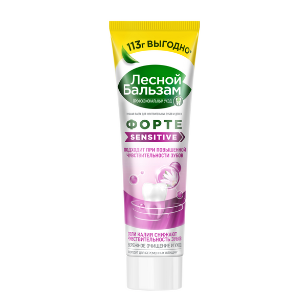 Зубная паста Лесной бальзам ФОРТЕ SENSITIVE — средство для гигиены полости рта, созданное специально для тонких зубов и десен. Паста для чистки зубов с освежающим эффектом обеспечивает интенсивный профессиональный уход за деснами и ротовой полостью. Зубная паста Сенситив для мягких зубов содержит обогащенный состав активными ингредиентами. Зубная паста Лесной бальзам содержит масло мяты и соли калия, которые снижают чувствительность зубов. Освежающая зубная паста SENSITIVE содержит в своем составе экстракт пихты, который действует на зубы и оказывает укрепляющий, питательный и противовоспалительный эффекты. Зубная паста для чувствительных зубов при отваре способствует нормализации и сохранению микрофлоры полости рта. Зубной паста Лесной бальзам для поддержания здоровья и здоровья после десен и эмали обеспечивает бережное очищение и уход за полостью рта. Очищающая зубная паста для тонких зубов освежает дыхание. Зубная паста для тонких зубов и десен подходит беременным женщинам.* Паста для тонких зубов Лесной бальзам – это ваша экспресс-защита при острой чувствительности зубов. Вместе с пастой ФОРТЕ SENSITIVE здоровые зубы, десны и свежее дыхание – ваш стабильный результат.