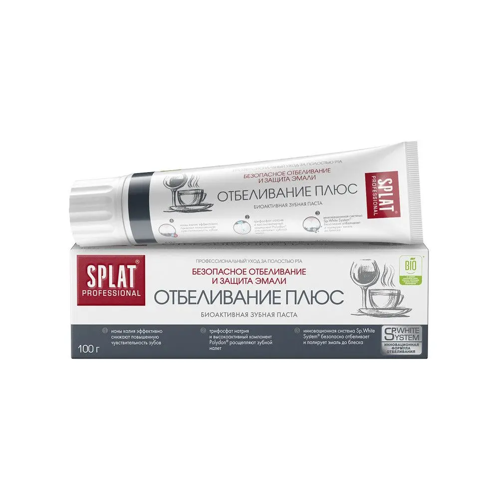 Зубная паста SPLAT Professional «Отбеливание Плюс» (WHITE PLUS) ухаживает за зубами и безопасно отбеливает их благодаря комплексу Sp.White System. За 4 недели использования эмаль становится светлее на 1,5 оттенка. Фермент папаин и отбеливающий компонент полидон эффективно расщепляют налет, способствуют сохранению белизны. Идеально подходит любителям кофе, чая и сигарет.