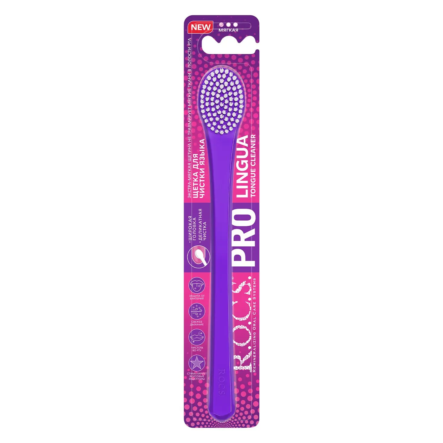 Щетка для языка R .O.C.S. PRO Lingua имеет большую чистящую площадь поверхности. Большая головка щетки обеспечивает быстрое и качественное удаление налета с поверхности языка. Очень тонкая, ультрамягкая безопасная щетина имеет технологию тройной полировки кончиков и гарантирует бережный уход за мягкими тканями.