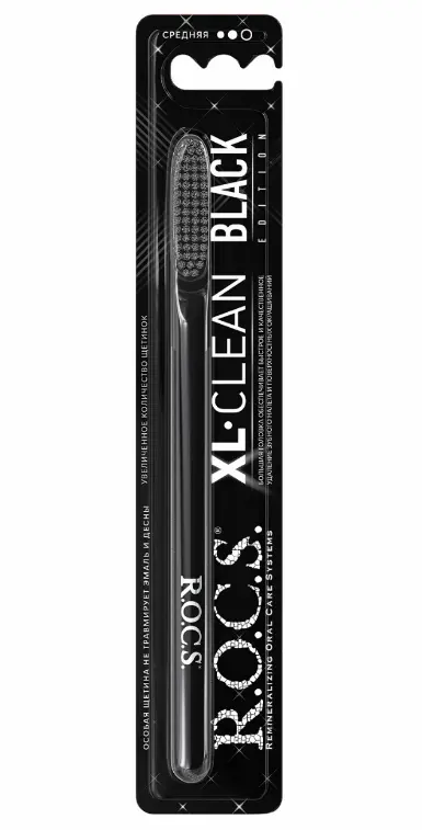 Зубная щетка R.O.C.S.® XL-CLEAN BLACK EDITION изготовлена с использованием текстурированной щетины с закругленными безопасными кончиками. Обеспечивают быстрое и качественное очищение, не повреждают эмаль, реставрации из пломбировочных материалов. Высокое качество очистки и легкий доступ к труднодоступным участкам полости рта, межзубным промежуткам, небной и язычной поверхностям зубов.