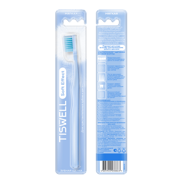 Мягкая зубная щетка для более тонких десен Tiswell Soft effect — это инструмент для эффективного ухода за полостью рта. Щетка для зубов Tiswell представляет собой идеальное сочетание простоты использования, качества и доступности. Зубная щётка мягкая голубая оснащена специальными ультратонкими** щетинками оригинальной формы. Зубная щетка для чувствительных зубов и десен с ультратонкими** зауженными щетинками позволяет увеличить давление на эмаль. Мягкая зубная щетка Tiswell Soft effect позволяет наблюдать болезненные ощущения при чистке зубов. Щетка для чистки зубов ультратонкими** щетинками бережно очищает налет. Голубая зубная щетка-подушка для взрослых с ультратонкими** щетинками создает эффект мягкого массажа и улучшает питание десен. Мягкая зубная щетка для взрослых помогает сохранить гладкость, блеск и естественную белизну зубов. Ультратонкие** зауженные щетинки легко проникают в межзубные промежутки, удаляемые там налет. Износостойкий материал щетины не поддерживает размножение на щетке°. Щётка зубная Tiswell Soft effect помогает поддерживать высокий уровень гигиены полости рта. Щетка мягкая зубная Tiswell Soft effect – это идеальное средство для ухода за чувствительными зубами и деснами. Голубая зубная щетка с мягкой щетиной пригодится каждому, кто хочет сохранить здоровье ротовой полости.