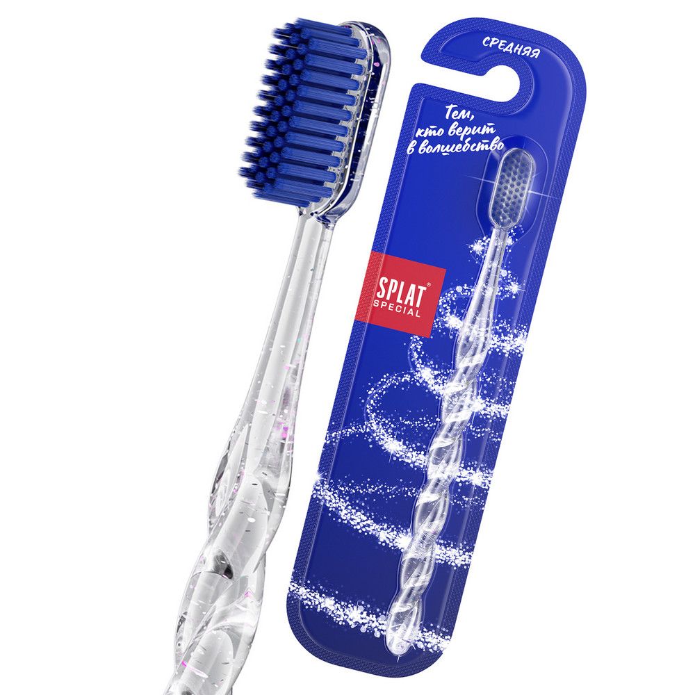 Мерцающая зубная щетка средней жесткости Splat Special — это лимитированная коллекция к Новому Году, созданная специально для тех, кто верит в волшебство. Начни Новый Год с улыбки и окунись в атмосферу праздника уже сегодня! Зубная щетка Splat Special создана для бережного ухода и эффективной чистки зубов. Специально разработанная щетина с ионами серебра предотвращает размножение бактерий в щетине, обеспечивая гигиену полости рта на высоком уровне. 2500 прорезиненных щетинок с закруглением кончиков очищают поверхность зубов от налета на 40% эффективнее обычной щетины, способствуя осветлению эмали до натурального оттенка и эффективно удаляя налет от чая, кофе, вина и табака. Благодаря продуманной форме и оптимальной средней жесткости эта зубная щетка подходит для ежедневного использования и помогает поддерживать гигиену полости рта и здоровье десен. Для наилучшего эффекта используйте вместе с мерцающей зубной пастой SPLAT Special с блестками — так вы добьетесь максимальной чистоты и сияния ваших зубов каждый день.
