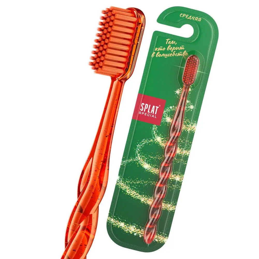 Мерцающая зубная щетка средней жесткости Splat Special — это лимитированная коллекция к Новому Году, созданная специально для тех, кто верит в волшебство. Начни Новый Год с улыбки и окунись в атмосферу праздника уже сегодня! Зубная щетка Splat Special создана для бережного ухода и эффективной чистки зубов. Специально разработанная щетина с ионами серебра предотвращает размножение бактерий в щетине, обеспечивая гигиену полости рта на высоком уровне. 2500 прорезиненных щетинок с закруглением кончиков очищают поверхность зубов от налета на 40% эффективнее обычной щетины, способствуя осветлению эмали до натурального оттенка и эффективно удаляя налет от чая, кофе, вина и табака. Благодаря продуманной форме и оптимальной средней жесткости эта зубная щетка подходит для ежедневного использования и помогает поддерживать гигиену полости рта и здоровье десен. Для наилучшего эффекта используйте вместе с мерцающей зубной пастой SPLAT Special с блестками — так вы добьетесь максимальной чистоты и сияния ваших зубов каждый день.