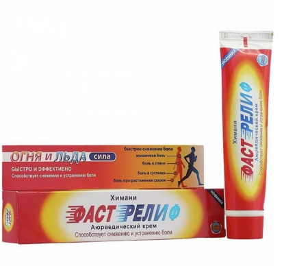 Крем Фаст Pелив - это продукт комплексной терапии для снижения и устранения различных видов боли, созданный на основе целебных природных ингридинетов по рецептам Аюрведы, науки о здоровье. Фаст Релиф вызывает расширение поверхностных сосудов, стимулирует кровообращение в коже и подкожной жировой клетчатке, оказывает мощное согревающее действие. При втирании в кожу ингредиенты крема вызывают раздражение нервных окончаний, сопровождающееся ощущением холода, легкого жжения и покалывания, оказывает сл поое местное анестезирующее действие.Быстро проникая в поврежденные участки тела, крем стимулирует циркуляцию крови и к пораженным тканям увеличивает доступ кислорода, снимает напряжение в мышцах, снижает и устраняет болевые ощущения в спине, суставах, при растяжении связок.
