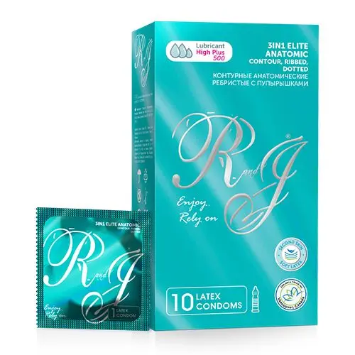 Презервативы из натурального латекса R and J 3in1 Elite Anatomic - Контурные Анатомические Ребристые с Пупырышками. 10 штук в упаковке. Смазка 500 mg. При производстве презервативов "R and J" используется технология "Thin Technology". Эта технология позволяет получать чувственные ощущения во время секса. Используется более мягкий латекс. При надевании нужно, аккуратно придерживая уплотняющее кольцо, мягко и не спеша, аккуратненько надеть презерватив