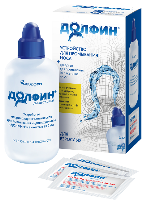 Долфин устройство для промывания носа индивидуальное 240 мл средство для промывания 10 пакетиков по 2 г для взрослых рецепт № 1