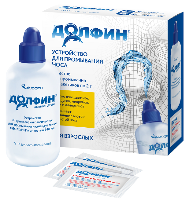 Долфин – устройство и специальное средство для промывания носа, способствуют удалению вирусов, бактерий и аллергенов за счет сквозного объемного промывания, 30 пакетов суммарно дают около 7 литров жидкости для промывания.